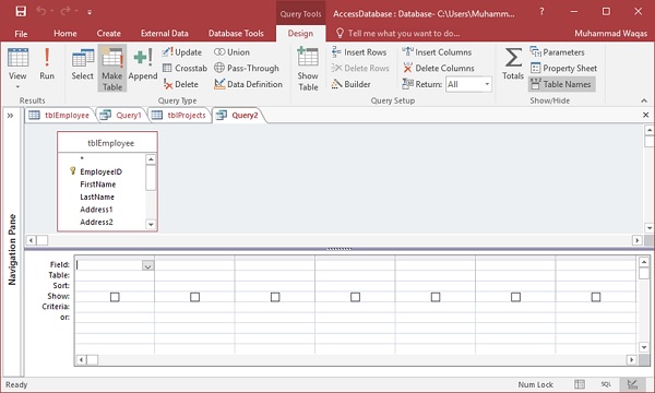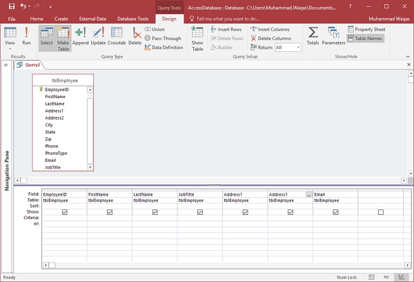 You can use a make-table query to create a new table from data that is stored in other tables. Let us go to the Create tab again and click Query Design.