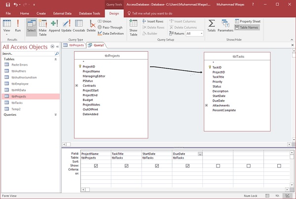 When you look at the relationship line, you will see a little arrow pointing towards ProjectID in tblTasks. When you run this query, you will see the following results.