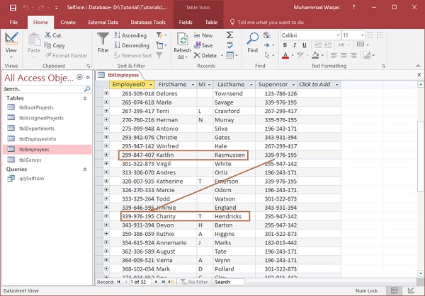 It displays the names of the employees along side the names of their supervisors. And, this is how you create a Self-join in Microsoft Access.