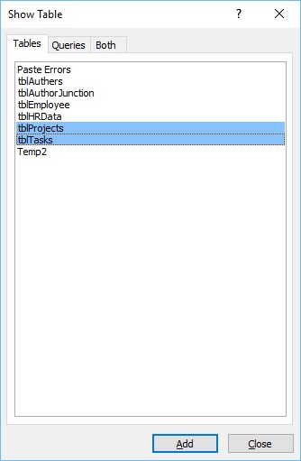 Let us now go to the Create tab and create a query from the Design View. Select tblProjects and tblTasks and close the Show Table dialog box as in the following screenshot.