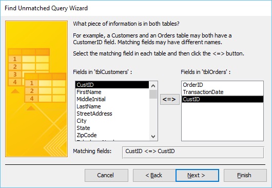 Here, we have CustID selected by default in both Fields in ‘tblCustomers’ and Fields in ‘tblOrders’. Now, click Next.