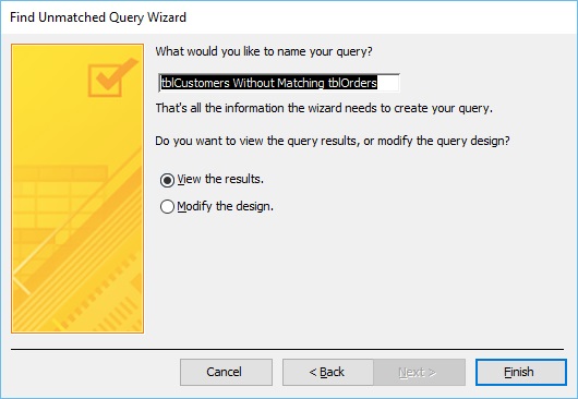 In Access, there is another very useful wizard and that is Find Unmatched Query Wizard. The Find Unmatched Query Wizard creates a query that finds records or rows in one table that have no related records in another table.